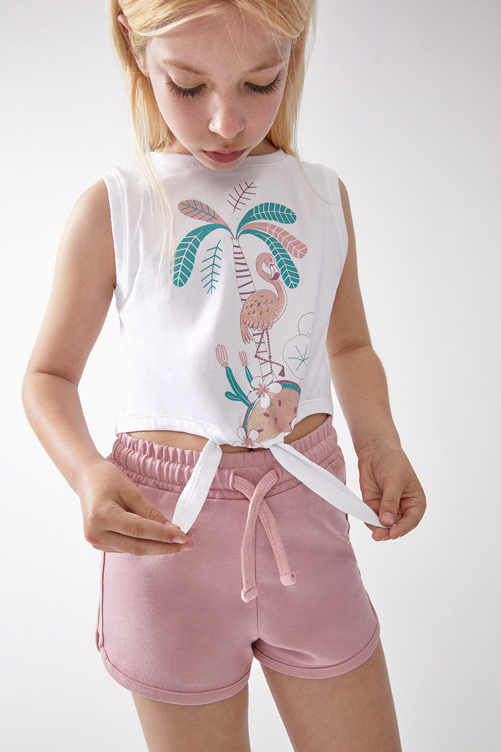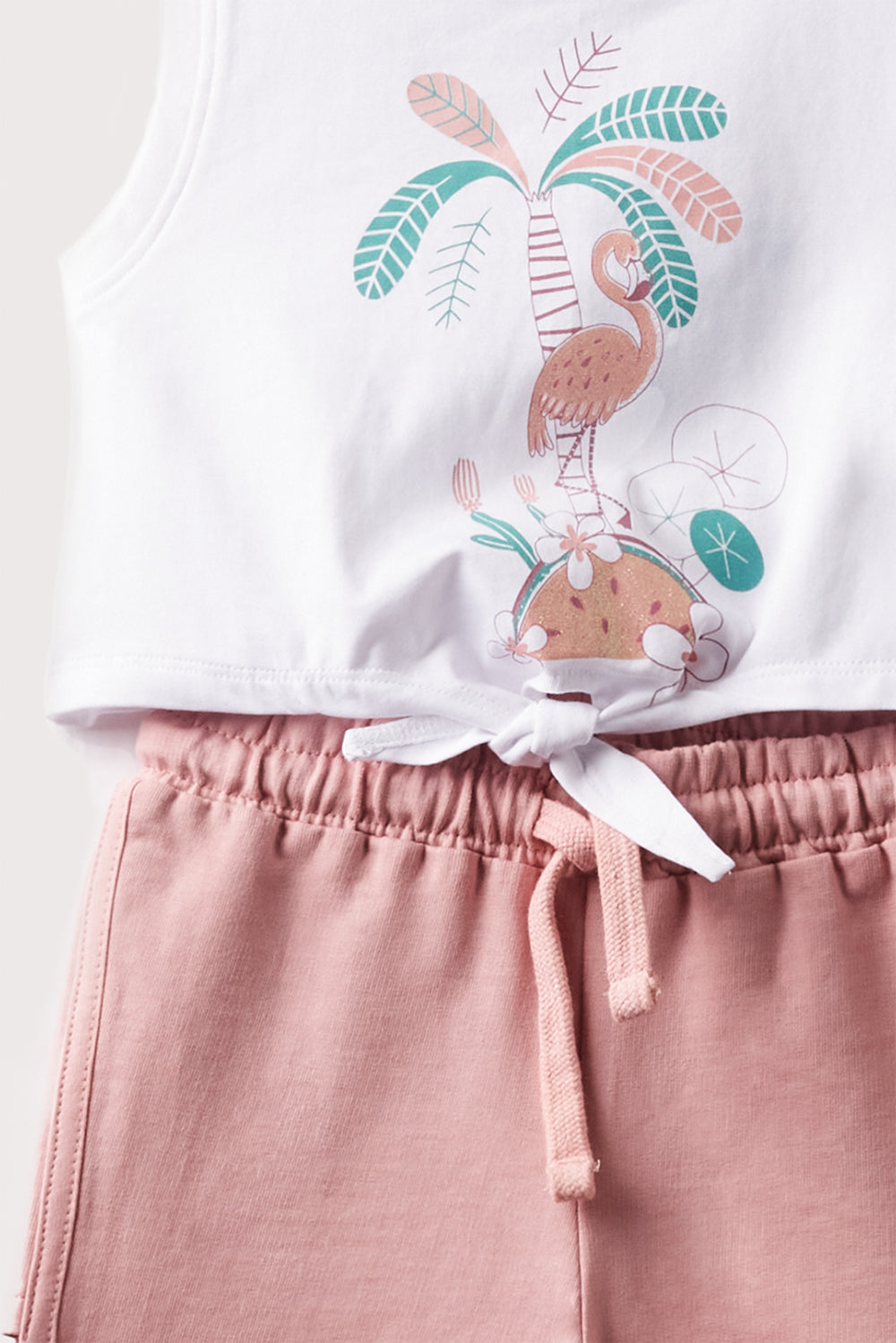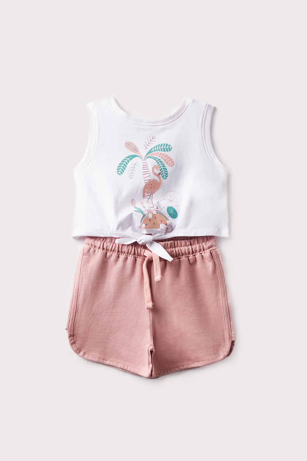 Conjunto de color maquillaje y camiseta flamenco en oasis anudada.