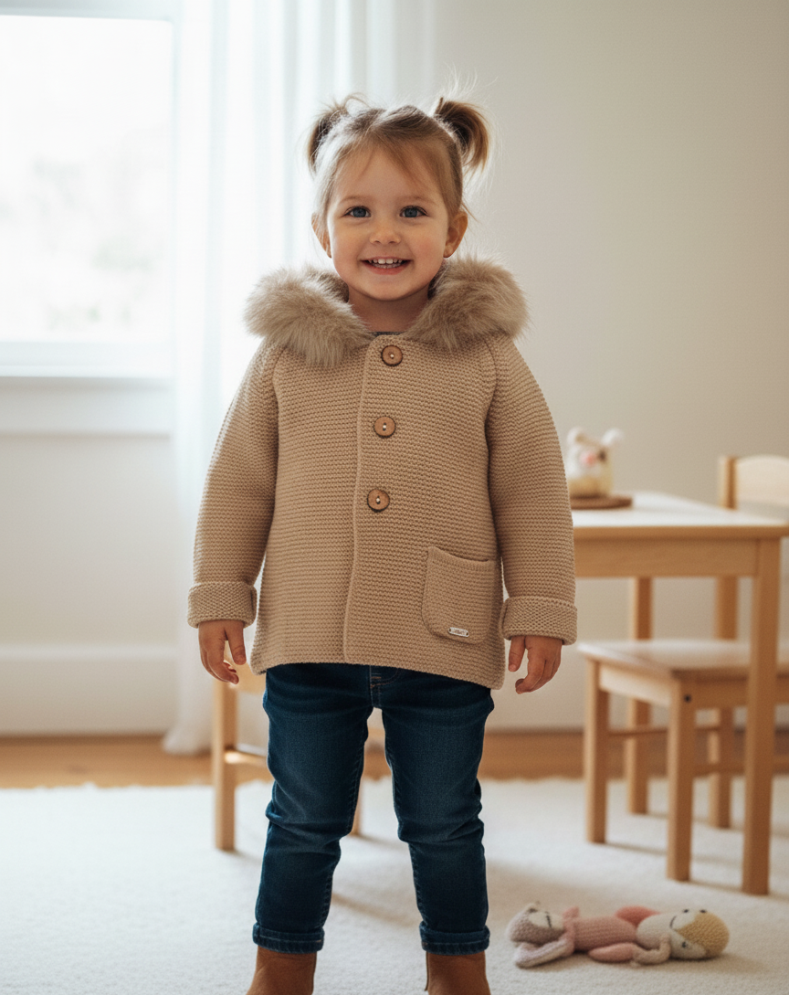 Es un abrigo pensado para bebé o niño pequeño, con un estilo clásico y elegante.