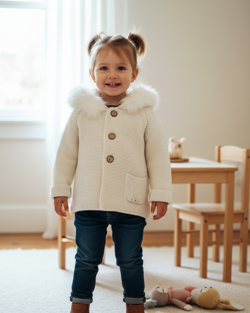 Es un abrigo pensado para bebé o niño pequeño, con un estilo clásico y elegante.