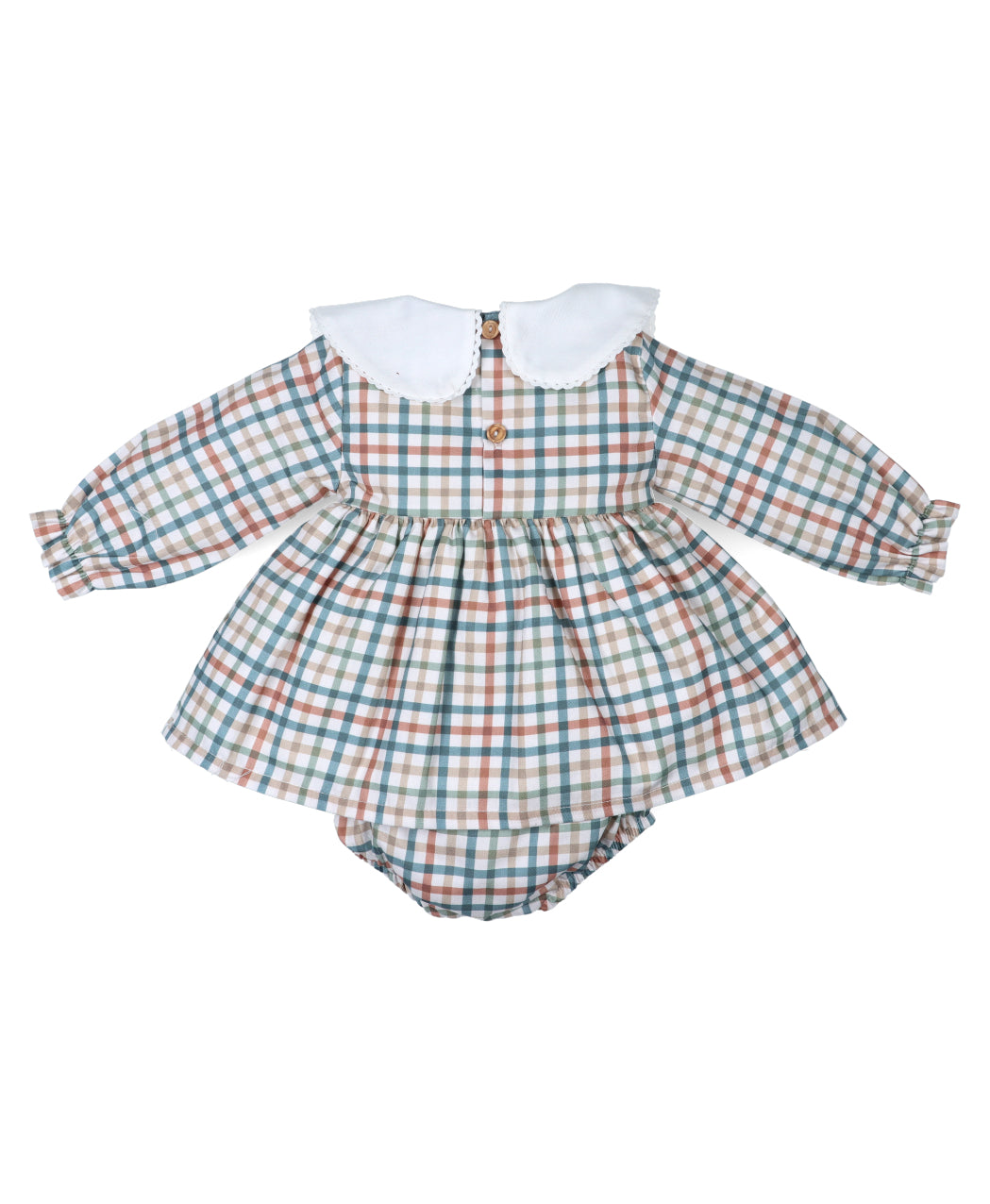 Las mangas largas cuentan con puños elásticos que aseguran comodidad y un ajuste adecuado. La parte trasera del vestido presenta una práctica abertura con botones de madera que facilitan el cambio, y el conjunto incluye una braguita a juego confeccionada con el mismo tejido de cuadros, completando el look de manera armoniosa.