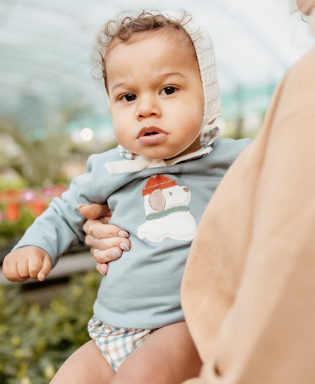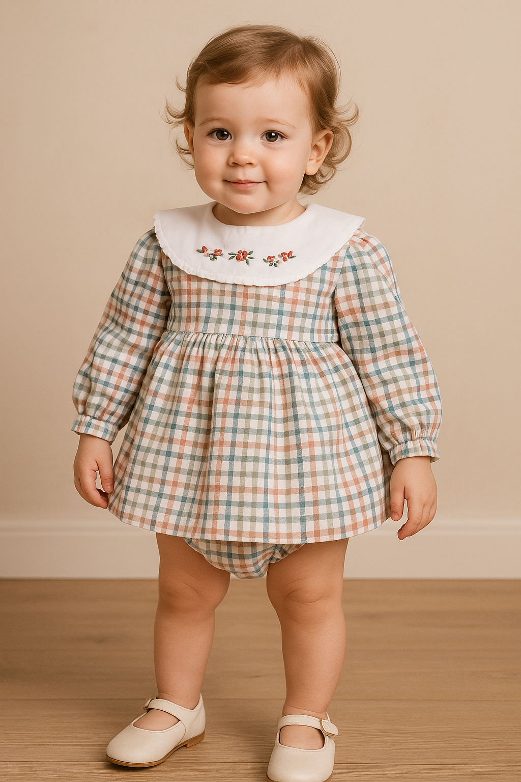 Este encantador jesusito para bebé niña combina elegancia y dulzura en un diseño clásico y atemporal. Confeccionado en un suave tejido de cuadros en tonos tierra, azul y blanco, este conjunto destaca por su delicado cuello blanco estilo babero, adornado con un bordado floral en tonos rojos y verdes que añade un toque artesanal y romántico.