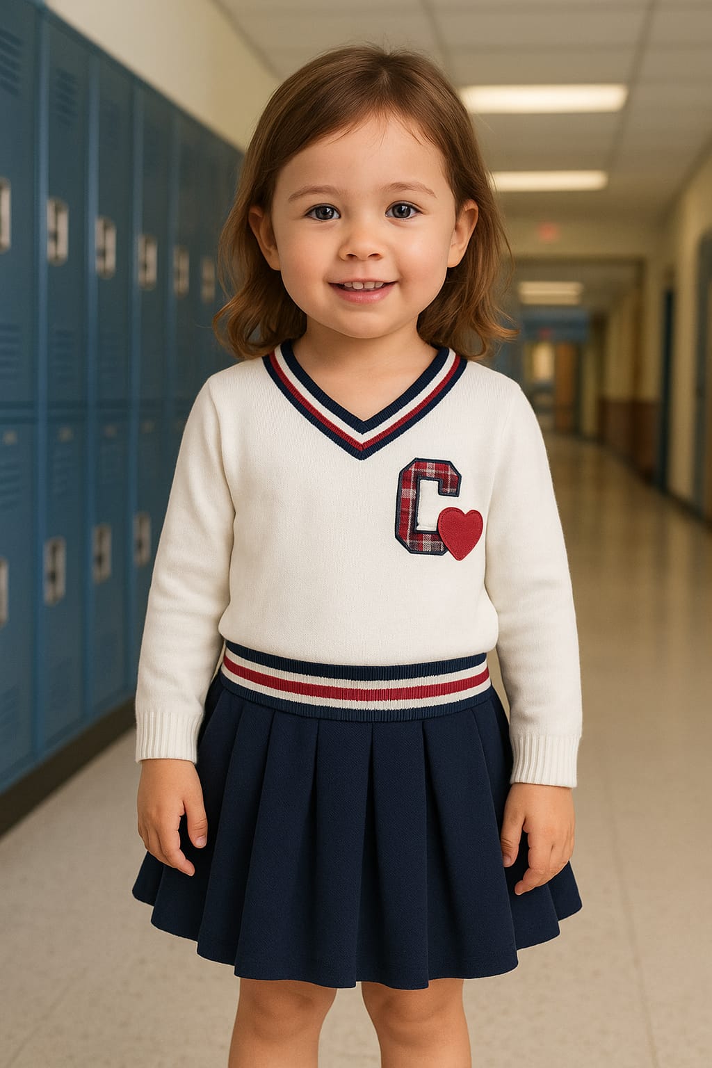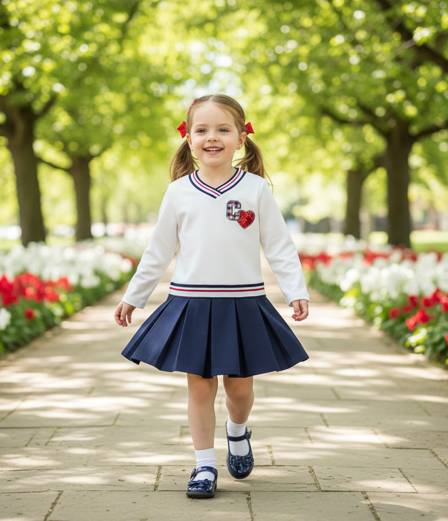 La falda es de color marino y destaca por su plisado alegre El corte es ligeramente acampanado, lo que da movimiento y comodidad al caminar o jugar.
