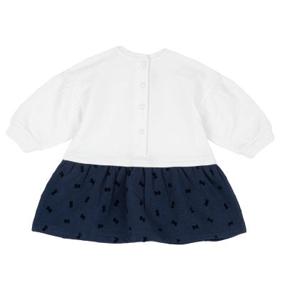 Este vestido infantil tiene un diseño muy tierno y elegante. La parte superior es de color azul marino con mangas largas, ideal para mantener abrigada a la niña en días frescos. El cuello está adornado con un volante blanco en forma de babero, que aporta un toque clásico y delicado.