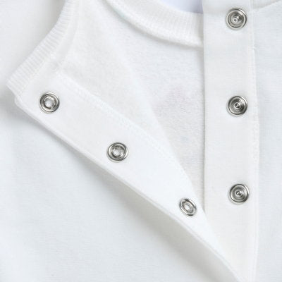 La falda es de color blanco y destaca por su estampado alegre de ositos en tonos beige y caramelo, acompañados de flores y corazones en azul marino y dorado. El corte es ligeramente acampanado, lo que da movimiento y comodidad al caminar o jugar.