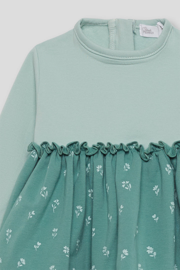 💚Este vestido de niña presenta un diseño encantador con una parte superior lisa de manga larga en un colore verde menta sueve. la parte de la falda es ligeramente mas oscuro esta adornado con un estampado de ligeras flores blancas y fruncido en la cintura para darle volumen y movimiento. Es una prenda cómoda para el día a día 💚