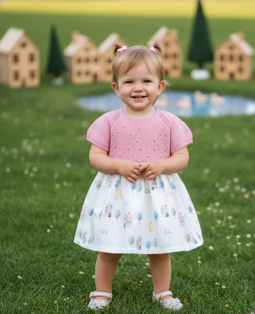 🪷 Vestido de arboles y casitas parte de arriba de punto maquillaje, apertura trasera con botones. popys