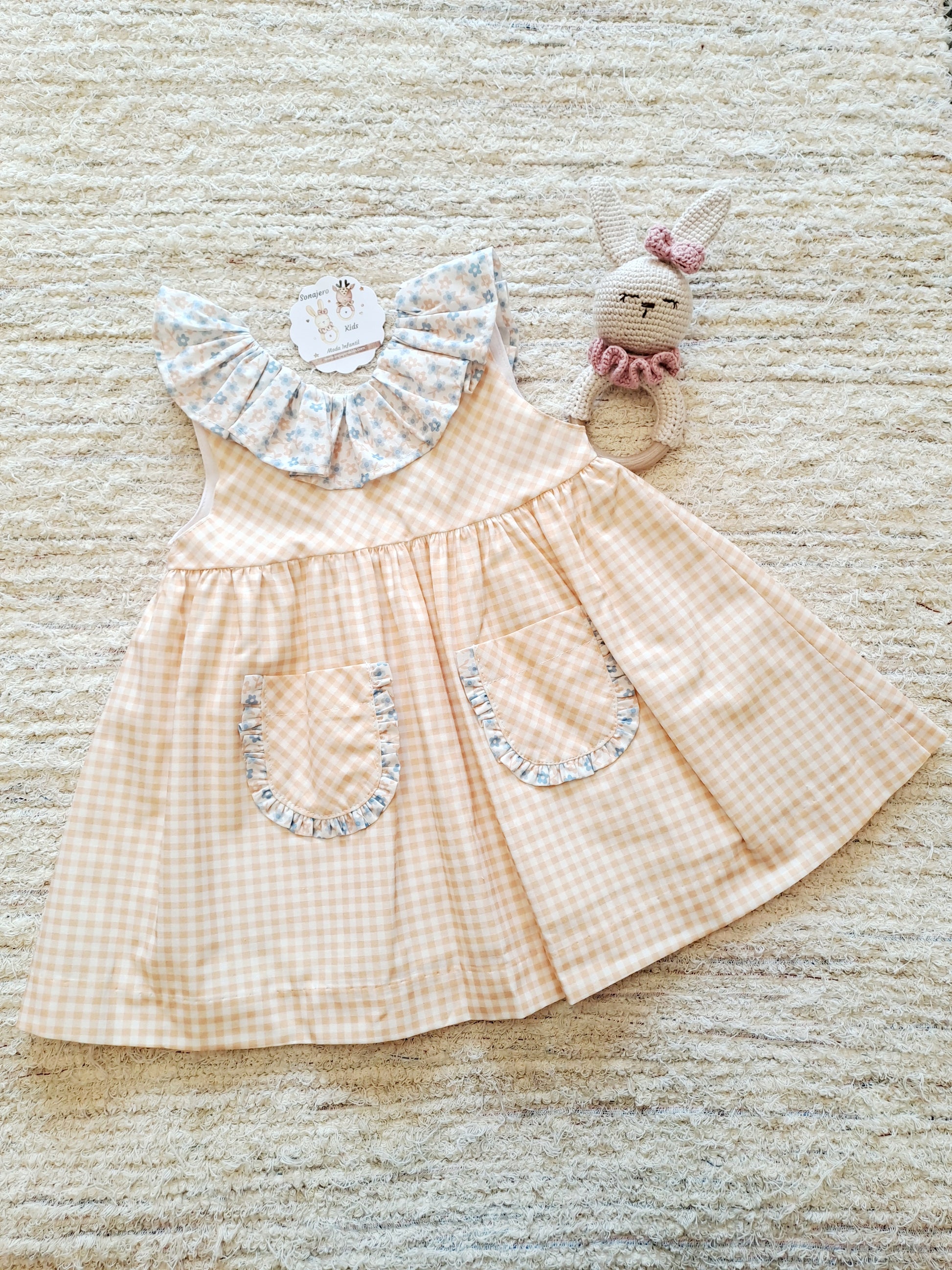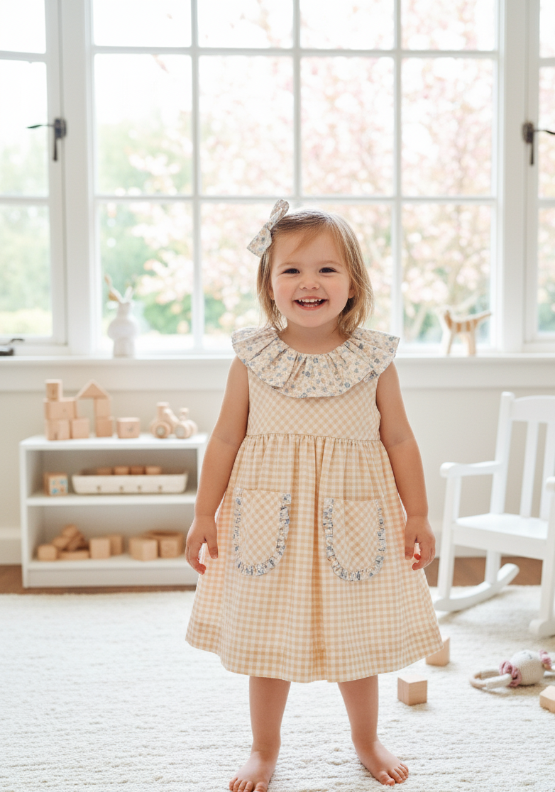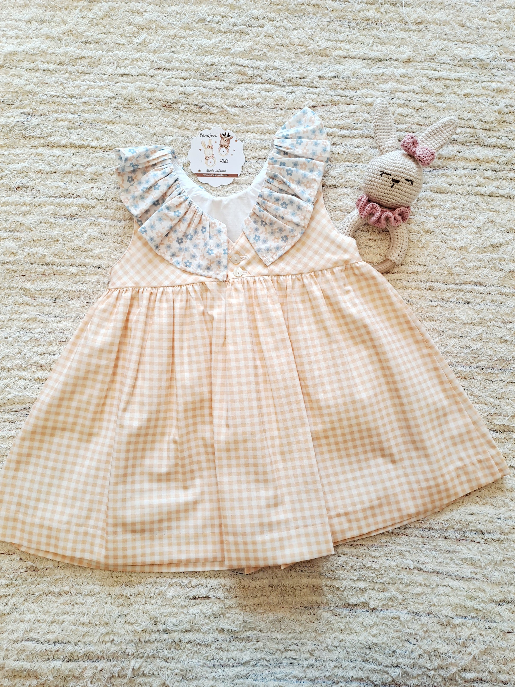 💙 Vestido de cuadro Vichy Calabaza con bolsillos delanteros y volante de flores, apertura trasera con botones .🩵