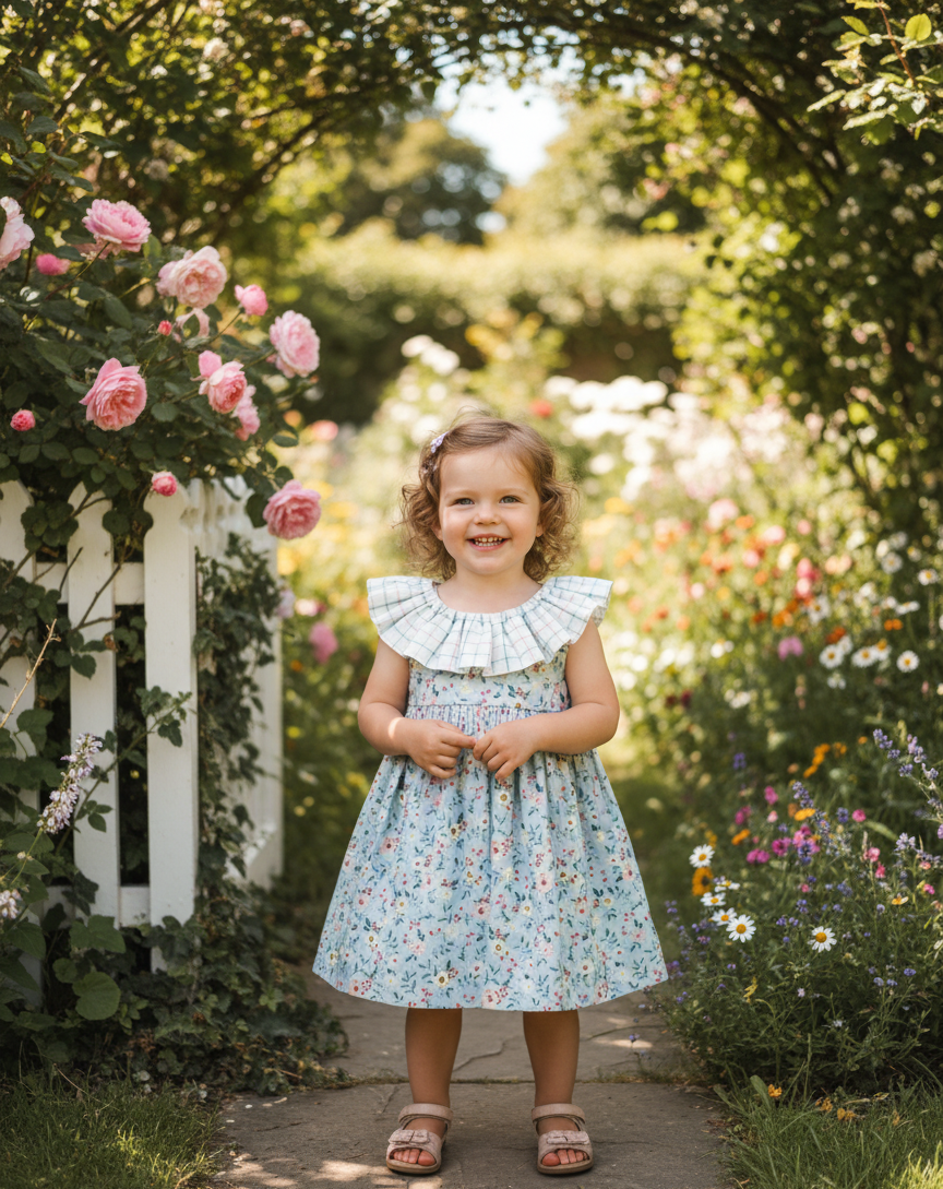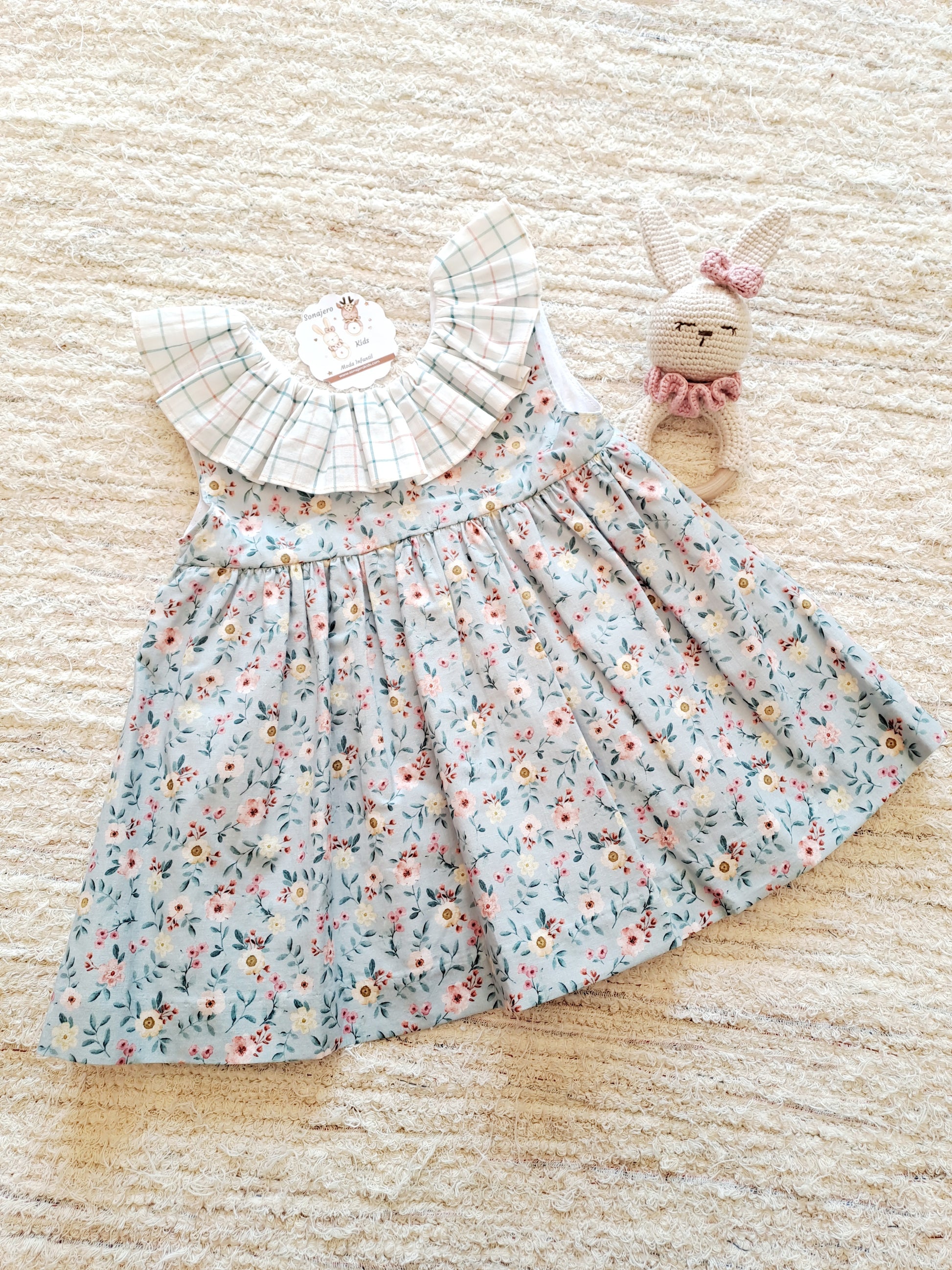 💙 Vestido de fores en base azul empolvado y volante de cuadros, apertura trasera con botones, va forrado por dentro .🩵