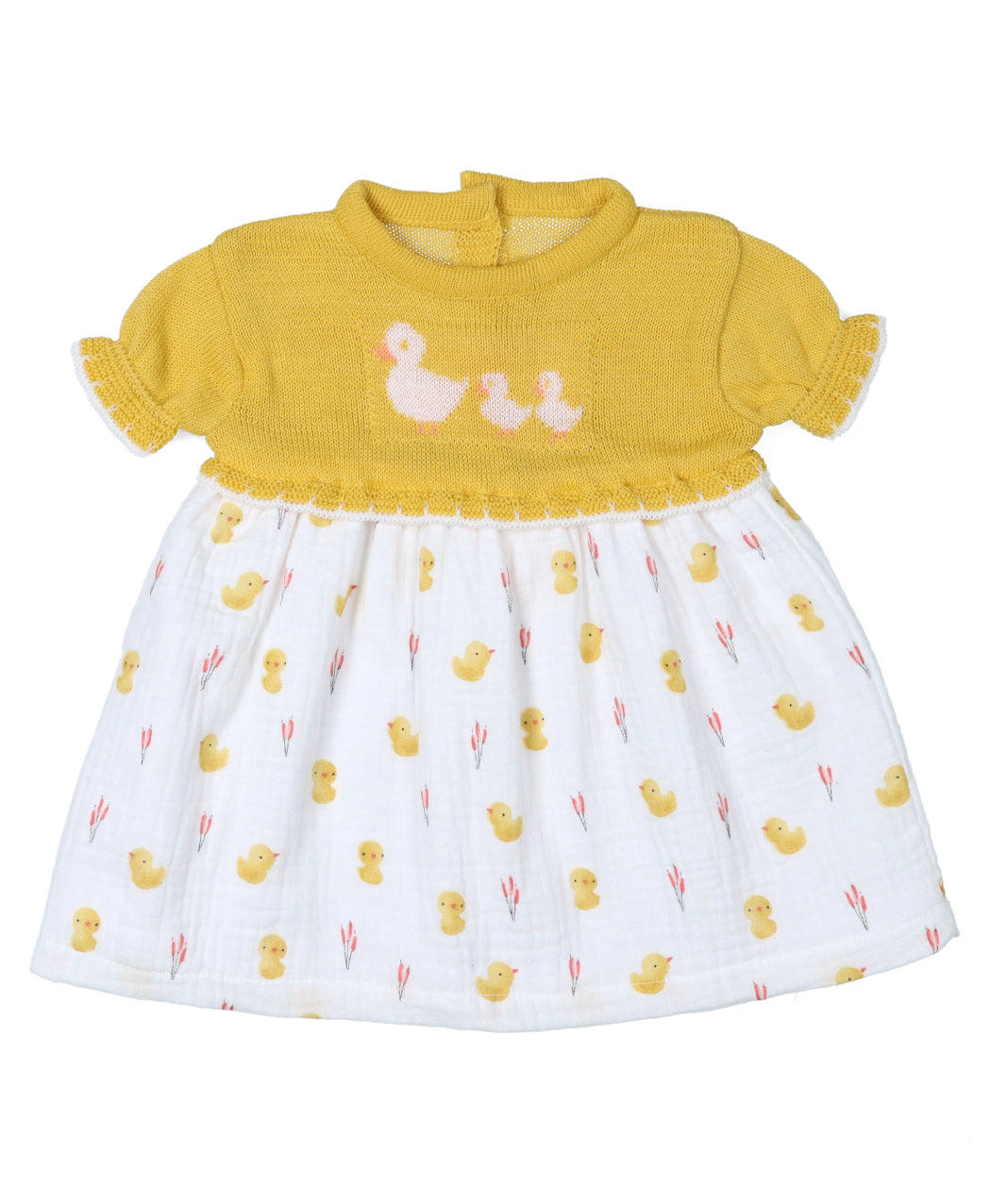 🪷 Vestido de hilo mostaza y mama pato con sus patitos, muselina blanca con mini patos , apertura trasera con botones. popys