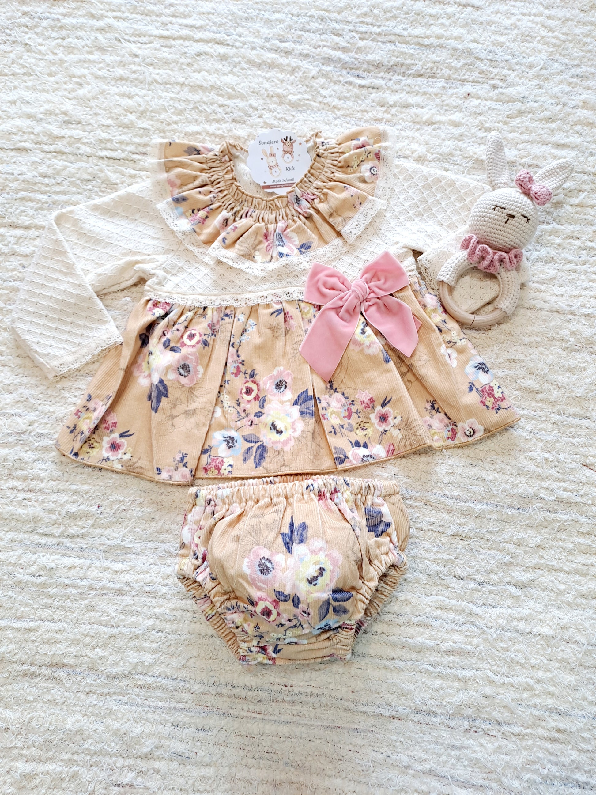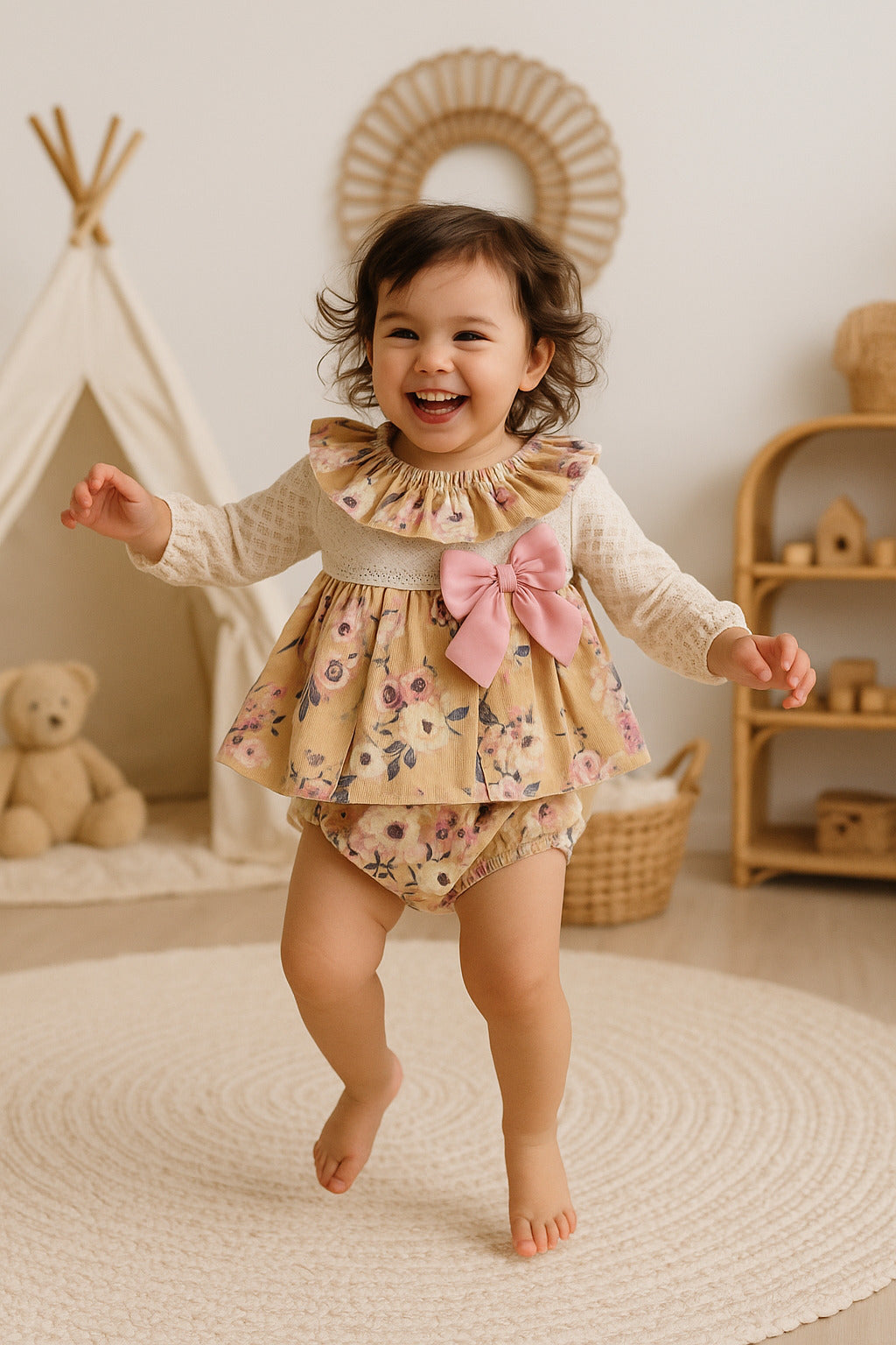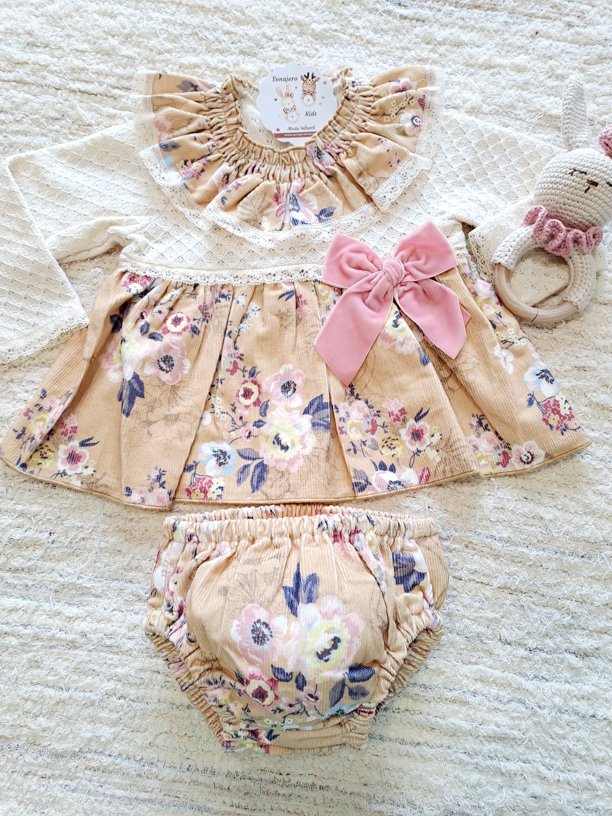 "Conjunto de dos piezas para bebé, con blusa de manga larga en encaje suave y faldita estampada con flores en tonos pastel. Detalles delicados como el gran lazo rosa y el cuello fruncido lo hacen ideal para ocasiones especiales."