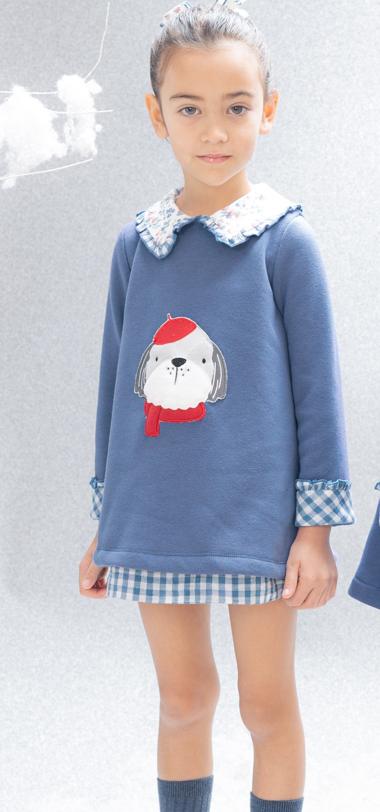 ¡Luce con estilo desde pequeñ@! 💫 El Vestido pompidou es pura ternura: vestido azul indigo con terminación de cuadro vichy y aplicación de perrito 🤍, y delicados volante estampado ✨. Un look cómodo, calentito y elegante 🧁👗
