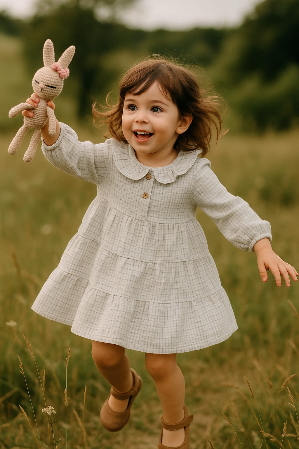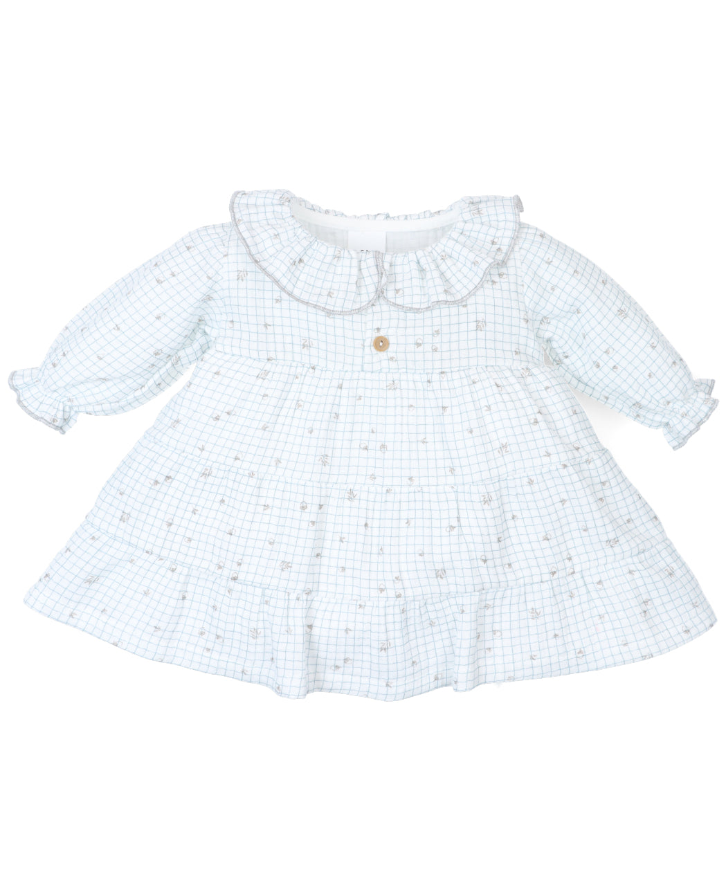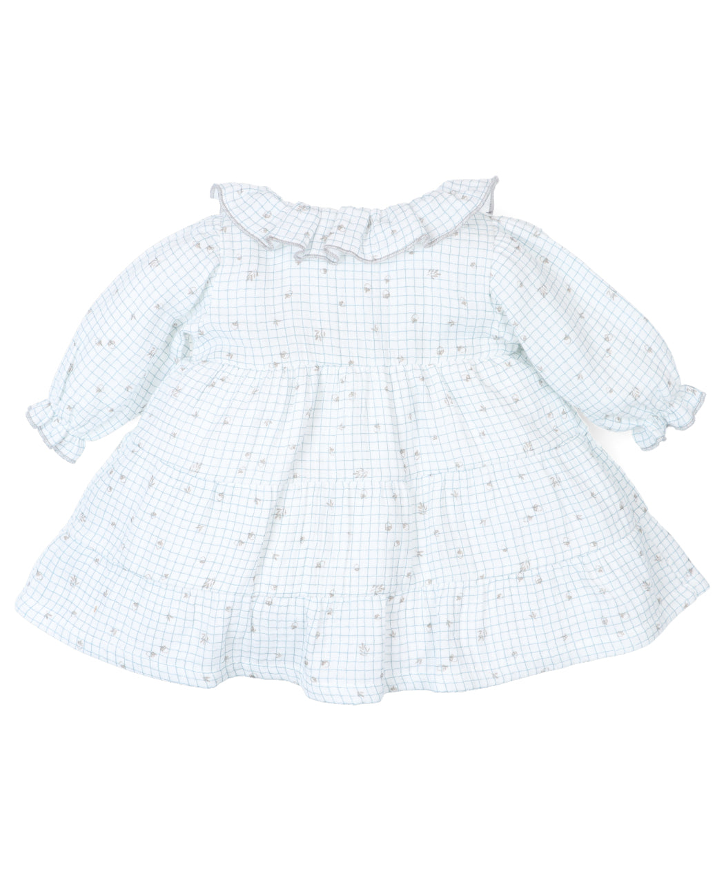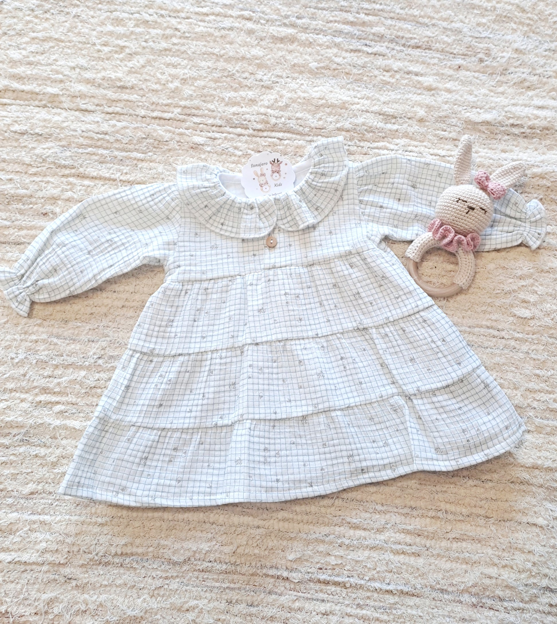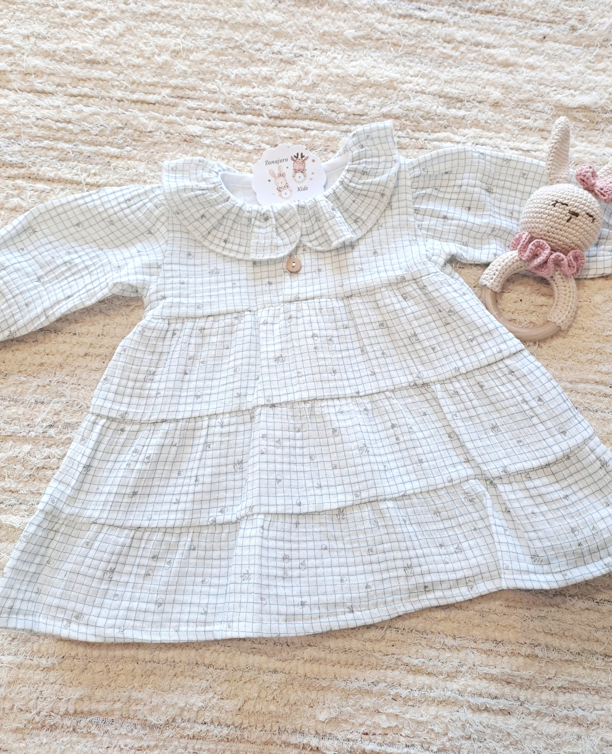 Vestido de Muoseline Blanco con cuadro en celeste temática minibellota