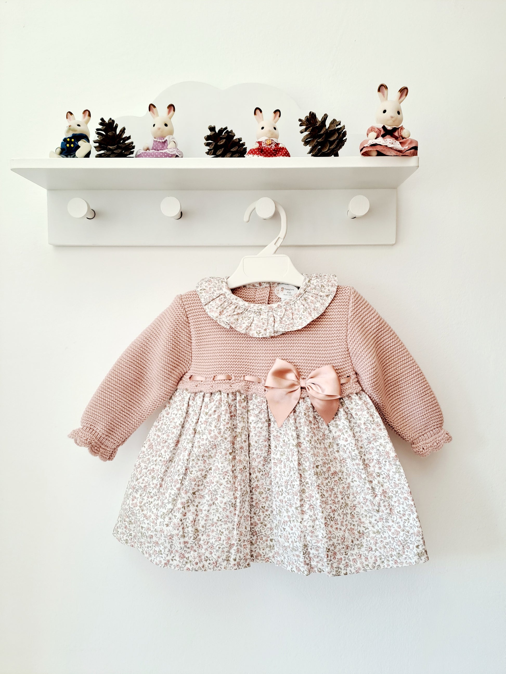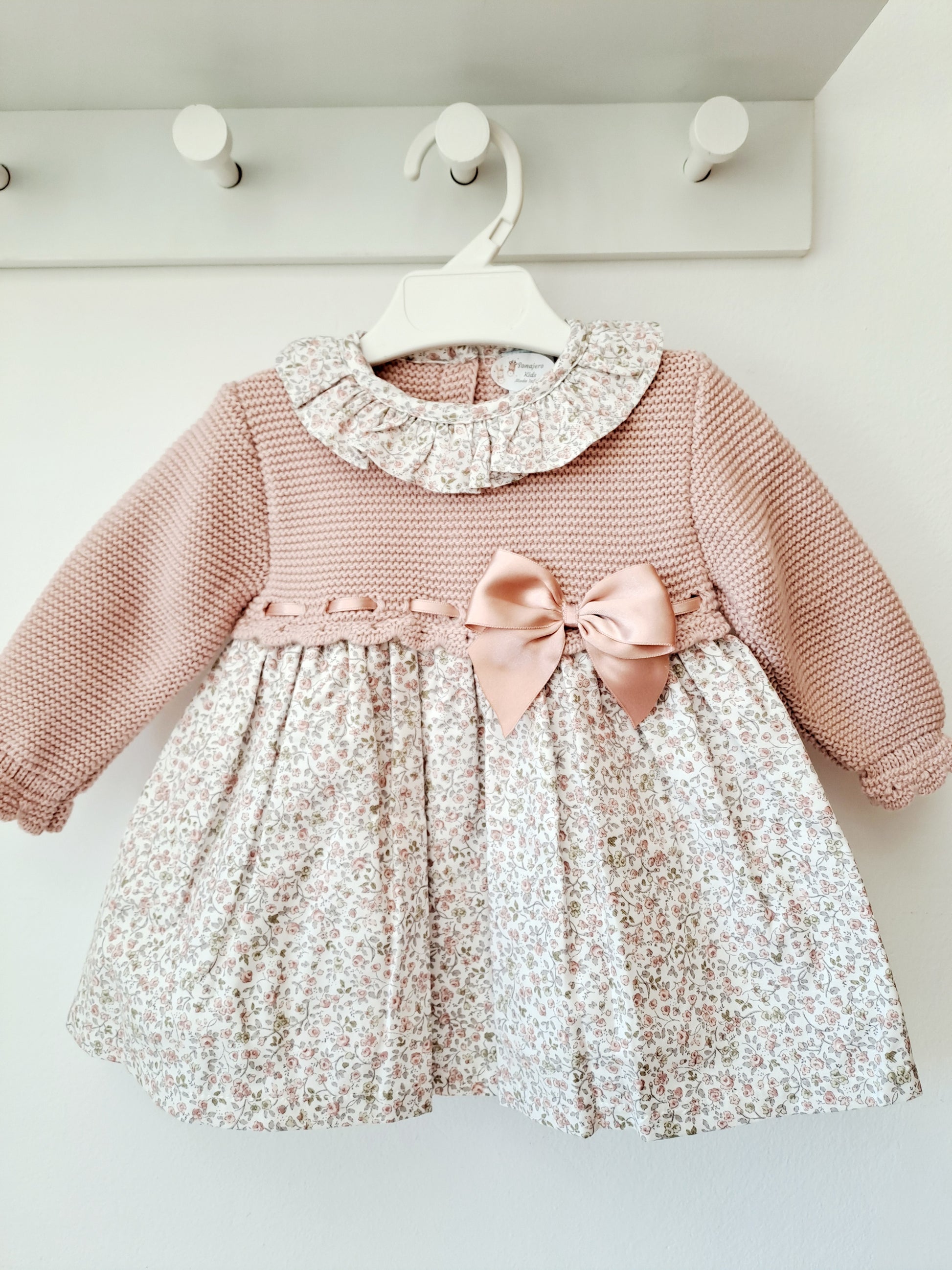 Este Vestido de puto bobo por la parte superior y Algodón con flores , decorado con un lazo nude en entrelazado con el tejido de punto y volante en el cuellos de mismo tejido de flores, la apertura trasera abotonada y con forro por dentro