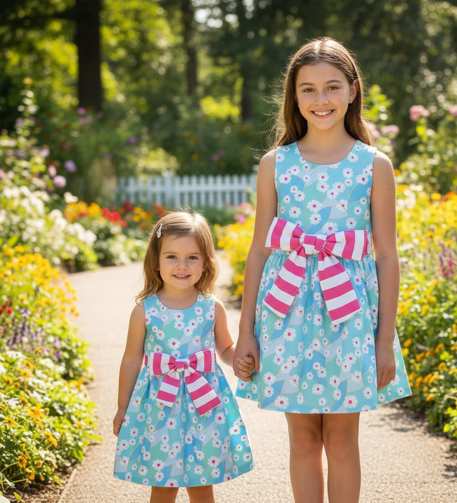 Vestido turquesa de margaritas con cinturón a rallas fucsia y blanco
