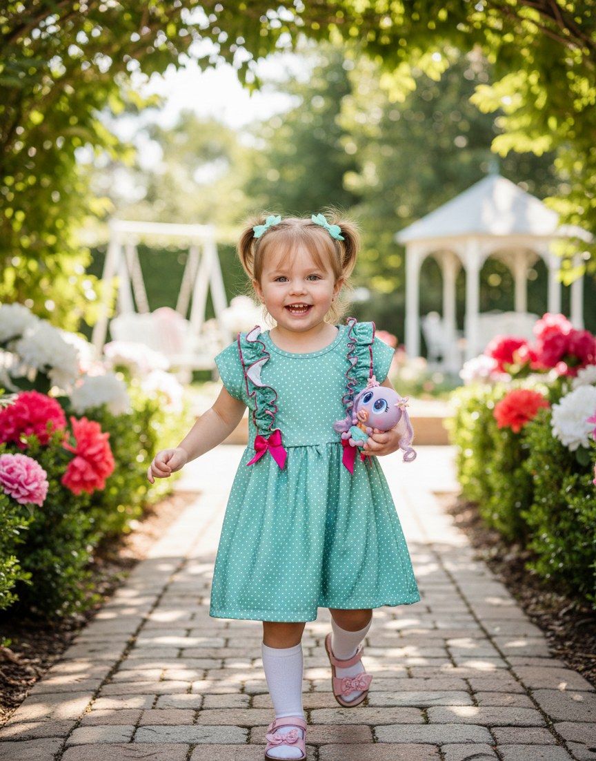 📣VESTIDO VERDE DE TOPOS BLANCOS Y LAZO FUCSIA📣